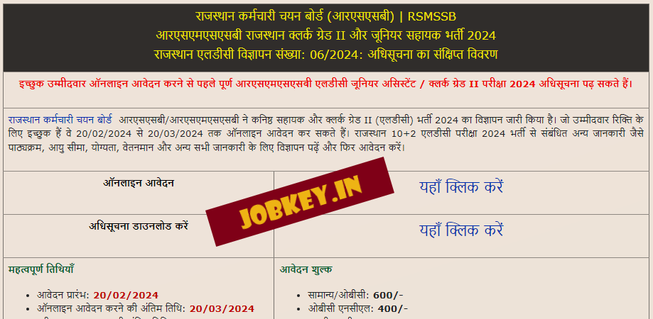 Rajasthan Staff Selection Board (RSSB) | RSMSSBRSMSSB Rajasthan Clerk Grade II & Junior Assistant Recruitment 2024Rajasthan LDC Advt No. : 06/2024 : Short Details of Notification |